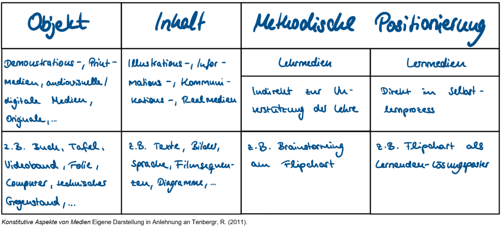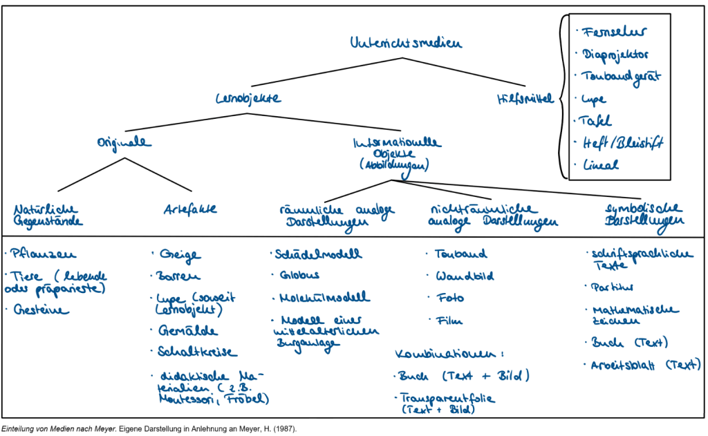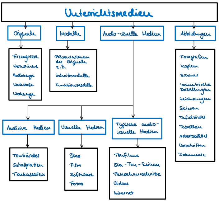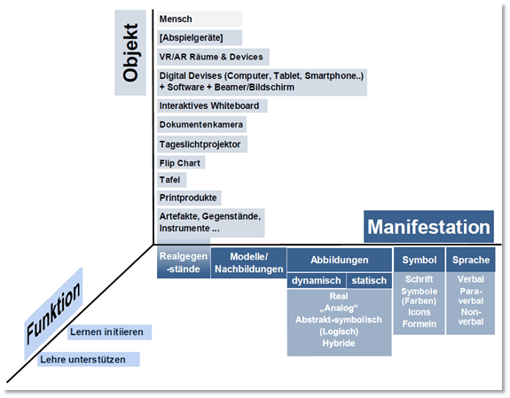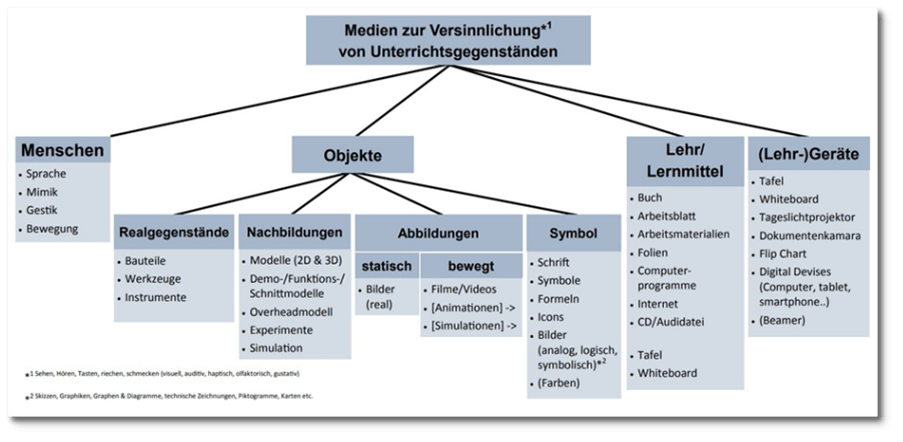 Medien sind vermittelnde Elemente im formellen Unterricht zur Unterstützung und Initiierung von Lernprozessen. Eine eindimensionale Klassifizierung ist jedoch kaum möglich – sie ist vielmehr als Kriterienkonstrukt, das durch die drei Parameter – Funktion, Manifestation, Träger/Objekt – determiniert ist (vgl. Weich 2020). Nur im Kontext dieses Schemas kann von Unterrichtsmedien gesprochen werden. So ist bspw. der Computer in diesem Sinne kein Unterrichtsmedium – er wird es erst, wenn eine didaktische Intention in Dependenz zur Funktion und Manifestation vorliegt (z. B. wenn er als Träger von Material (in Bild und Schrift oder Ton), das im Rahmen einer Lerneinheit recherchiert werden soll, eingesetzt wird).