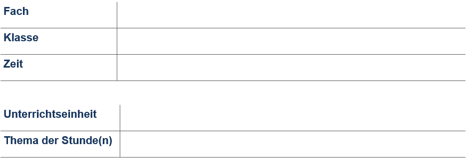 | Zielangabe | Thema der Stunden [#Thema der Stunde, häufig in Kombination mit dem Festhalten der Überschrift an der Tafel. Damit der/die Schüler:in Thema und Ziel vor Augen hat. ] Zielangaben [#Hier wir notiert, was man den Schüler:innen sagt, was die Ziele der Einheit sind und was sie lernen werden bzw. abschließend können] | 2-3 | ||||